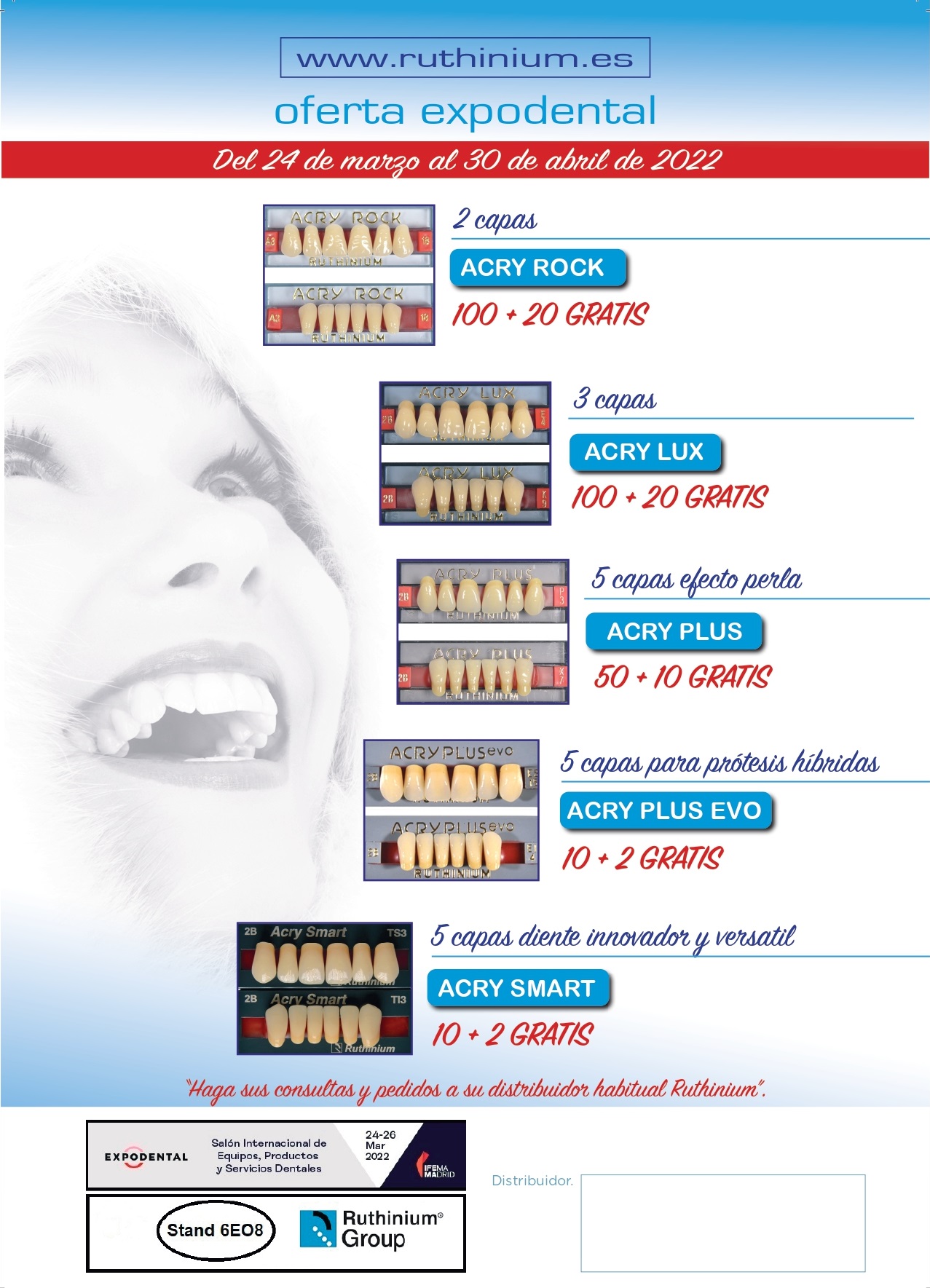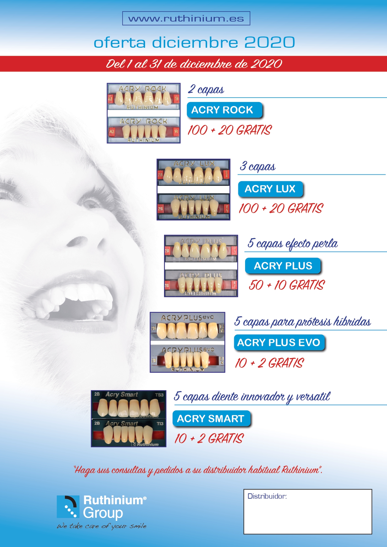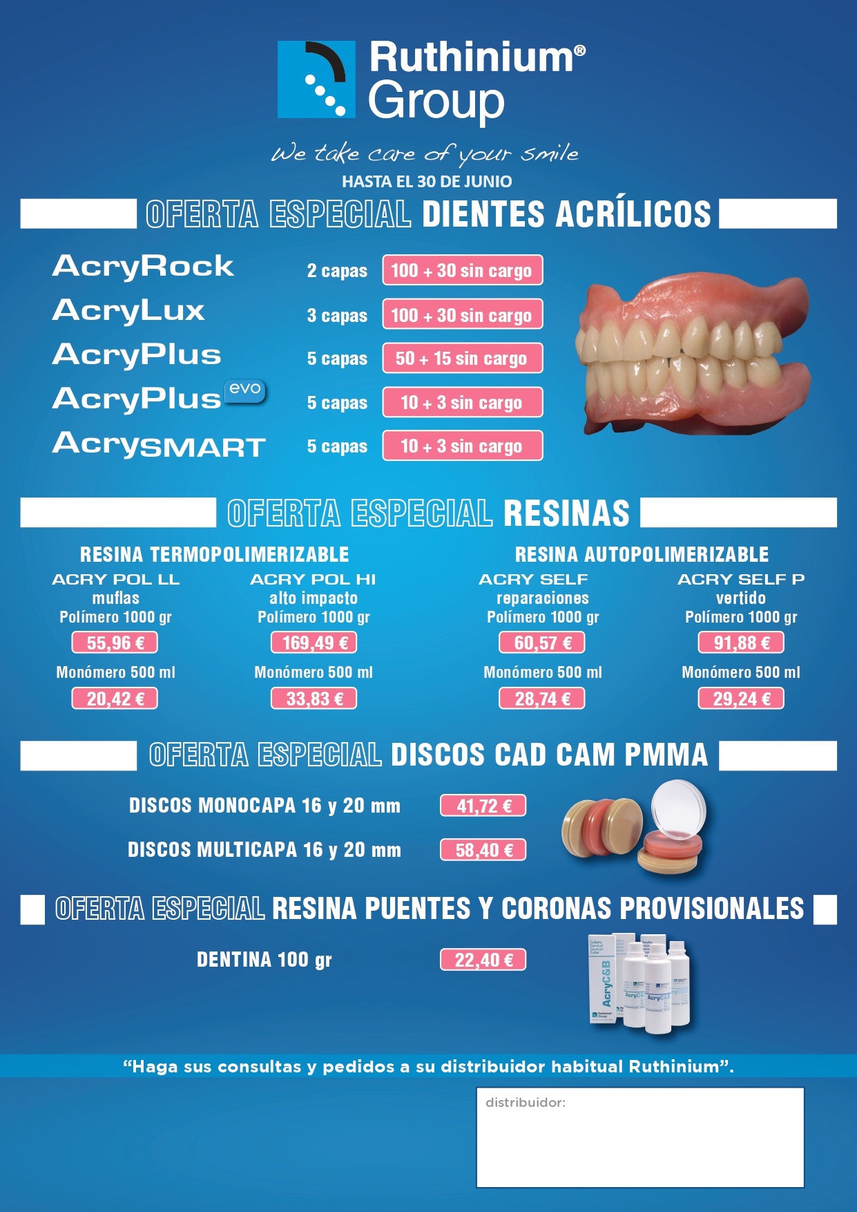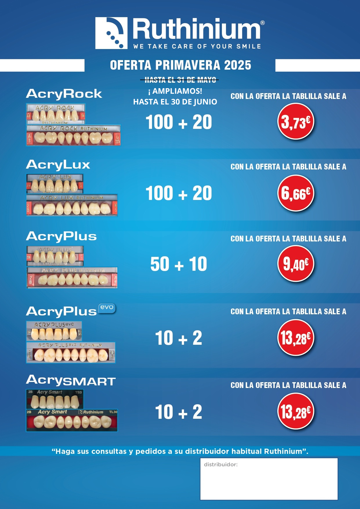 El depósito dental Baherdent SA distribuidor oficial de la marca Ruthinium y de los dientes Acry Rock, Acry Lux, Acry Plus y Acry Smart se complace en comunicar que amplia su oferta en dientes hasta el próximo 30 de Junio. Haga sus consultas a su distribuidor autorizado Ruthiniu...