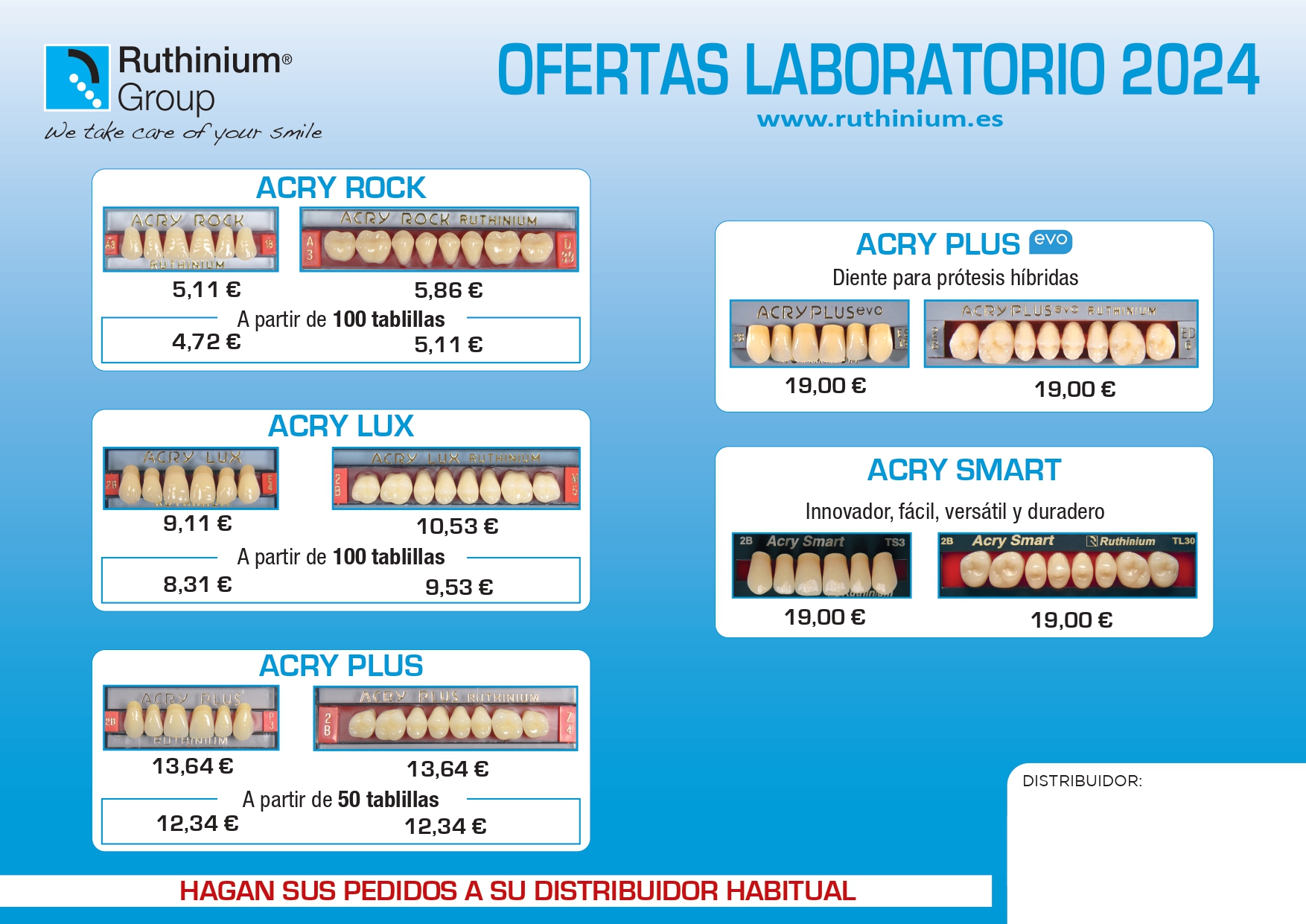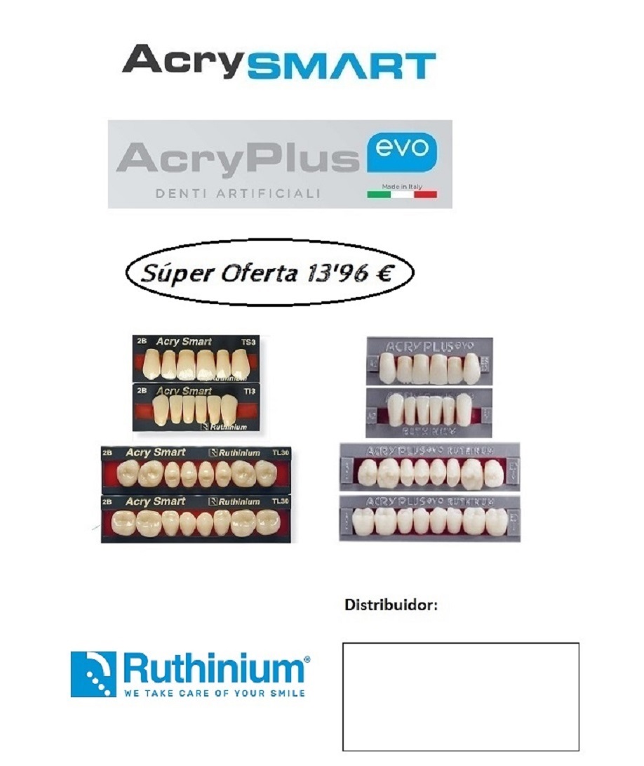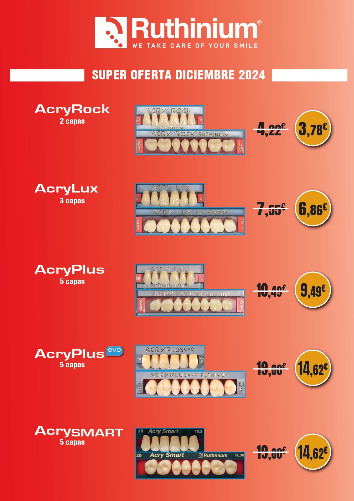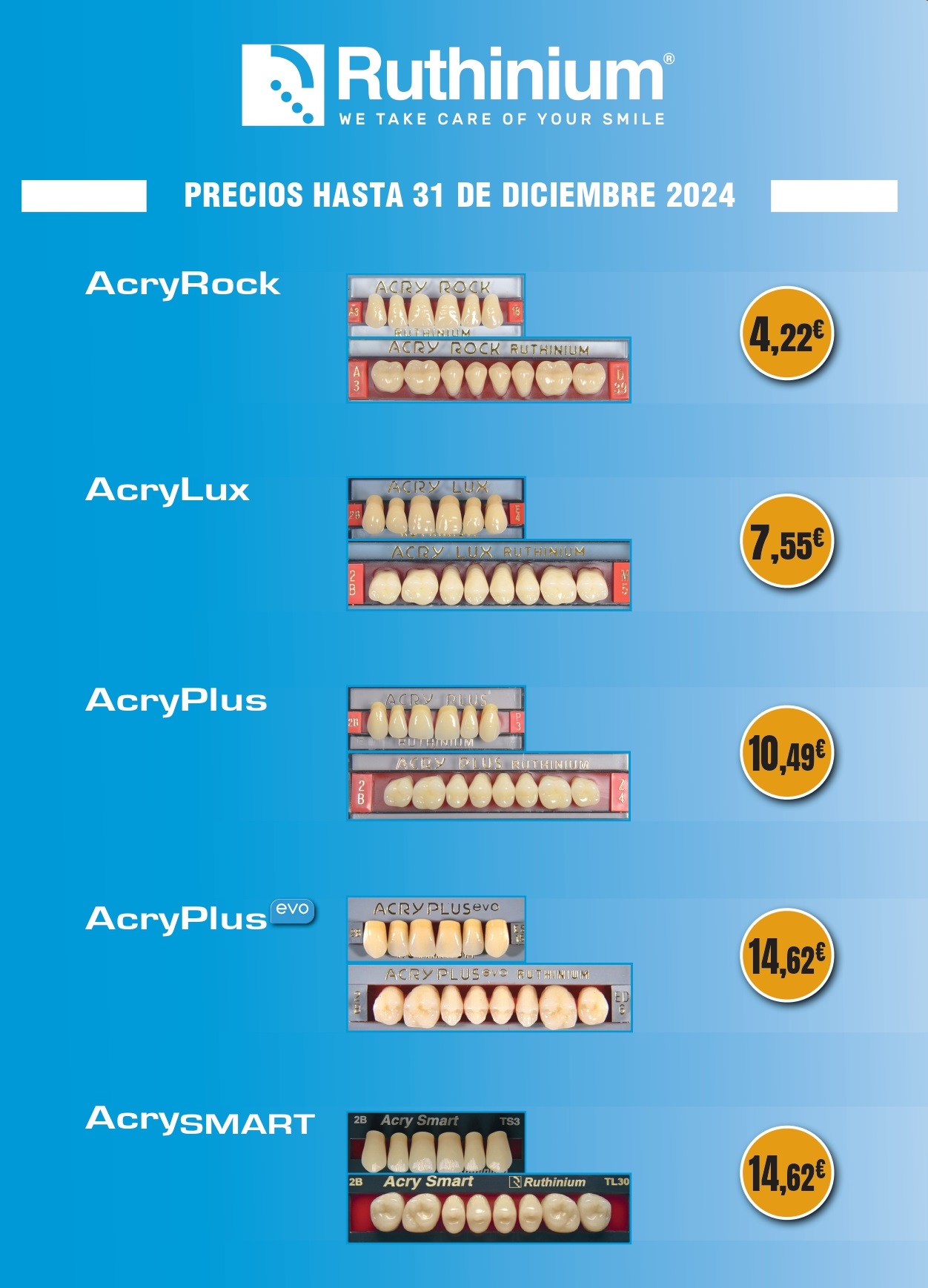 Baherdent SA Ruthinium Group Depósito Dental informa de las nuevas ofertas en dientes artificiales fabricados en PMMA. Acry Rock V: 4,22 € Acry Lux: 7,55 € Acry Plus: 10,49 € Acry Plus EVO: 14,62 € Acry Smart: 14,62 € Sin pedido m&iacu...