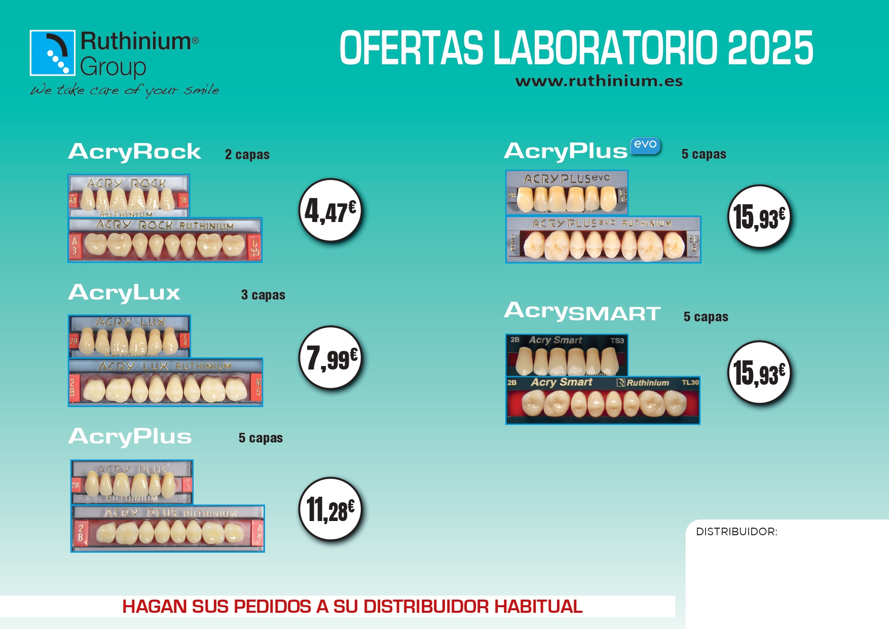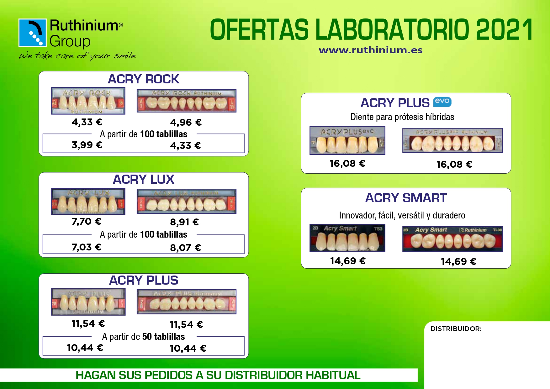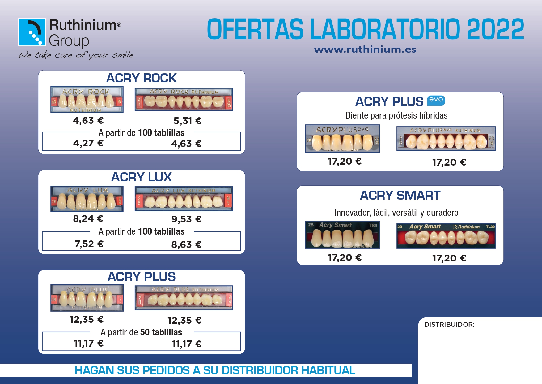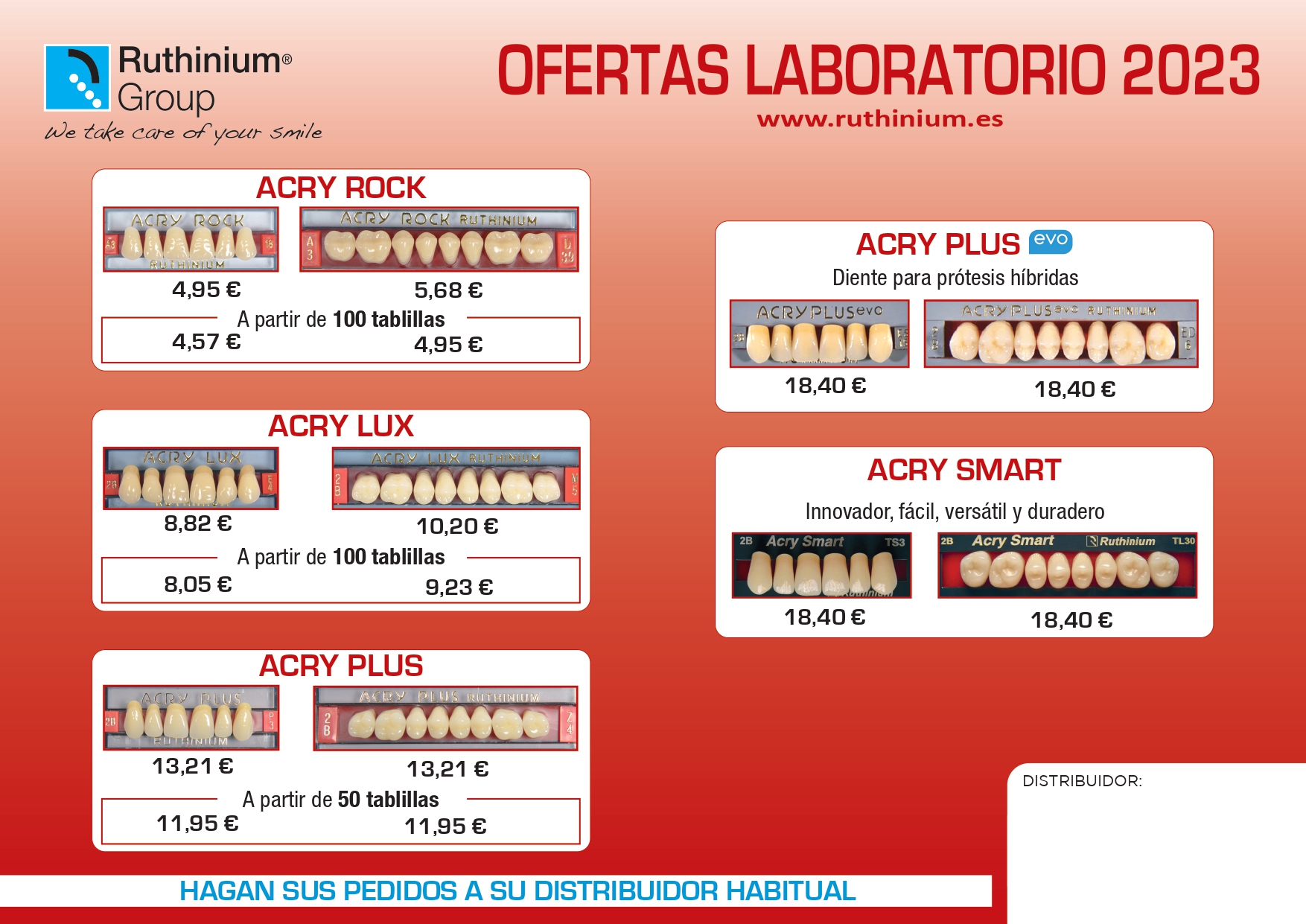 Baherdent SA Ruthinium Group Depósito Dental informa de las nuevas ofertas en dientes artificiales fabricados en PMMA. Acry Rock V: 4,22 € Acry Lux: 7,55 € Acry Plus: 10,49 € Acry Plus EVO: 14,62 € Acry Smart: 14,62 € Sin pedido m&iacu...