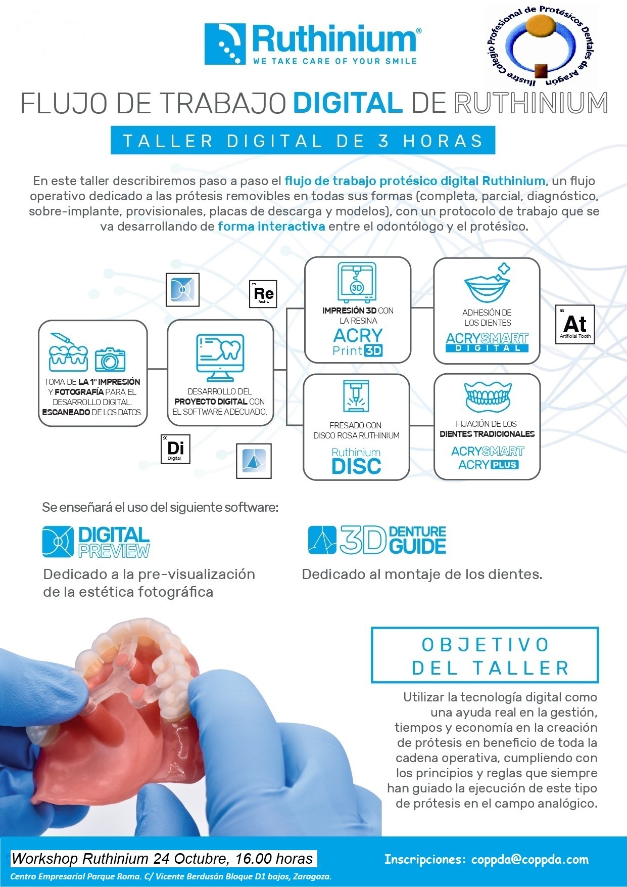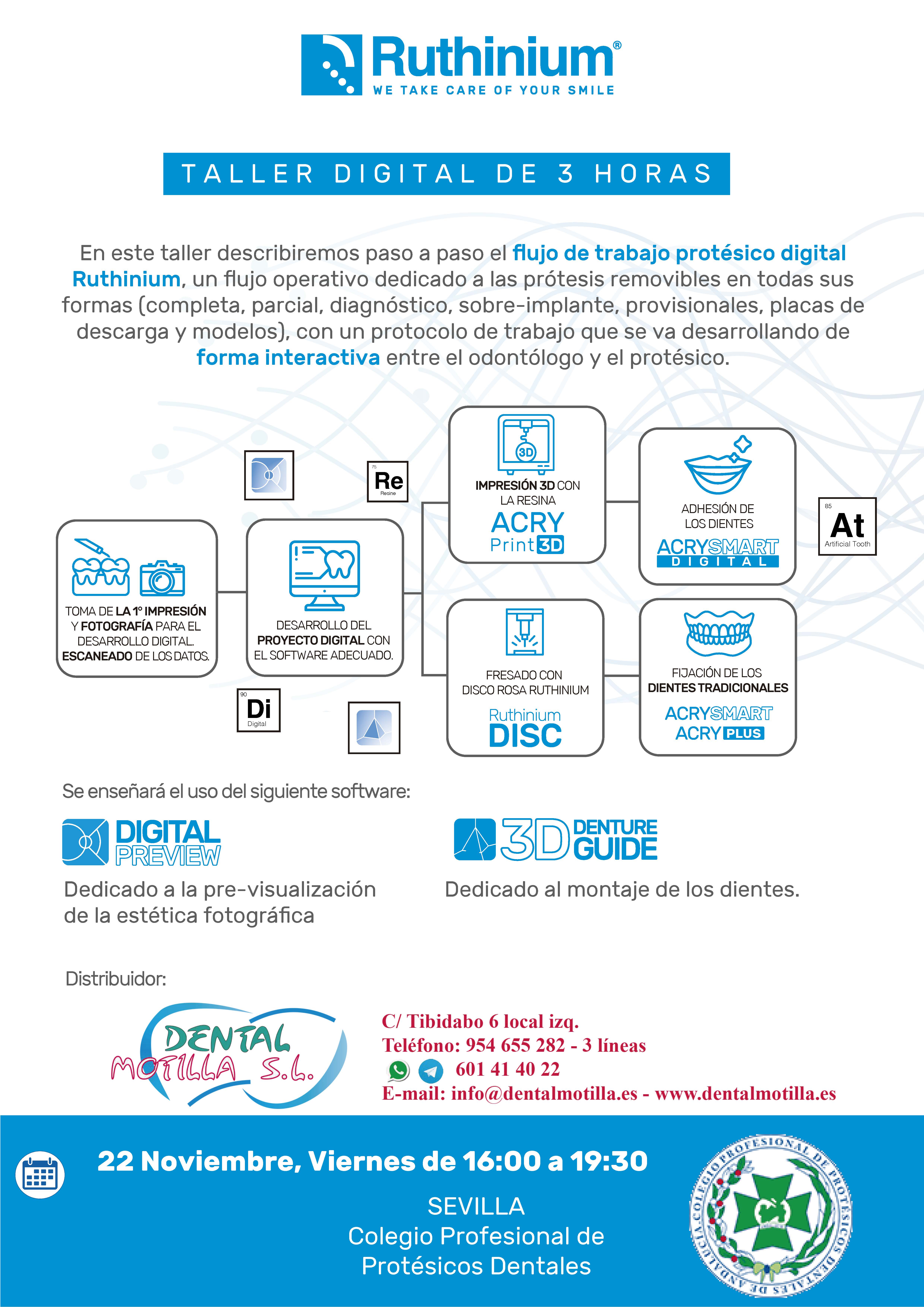 El depósito dental Baherdent SA Ruthinium Group en colaboración con el distribuidor de la marca en Sevilla Depósito Dental Motilla celebrará el próximo 22 de Noviembre un Taller Digital o Workshop Digital. En este taller se describirá paso a paso el f...